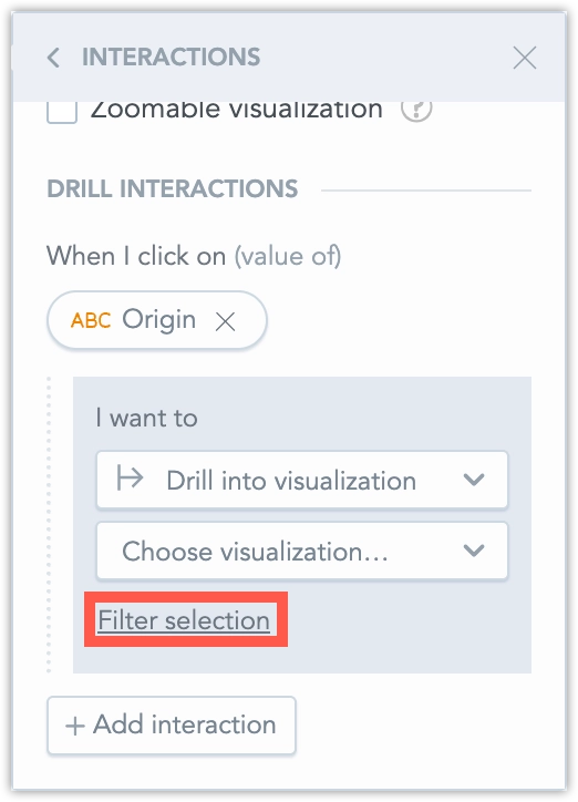 When you set up Drill into visualization and select a target visualization, the configuration shows Filter selection. This replaces the previous Pass as filter behavior. Click Filter selection to review and adjust which filters are passed to the drill destination.