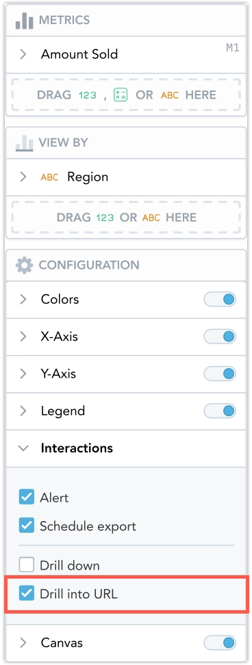 You can also override Drill to URL for a widget in dashboard Interactions. For example, you can remove URL drilling from a specific widget even if it is enabled globally.