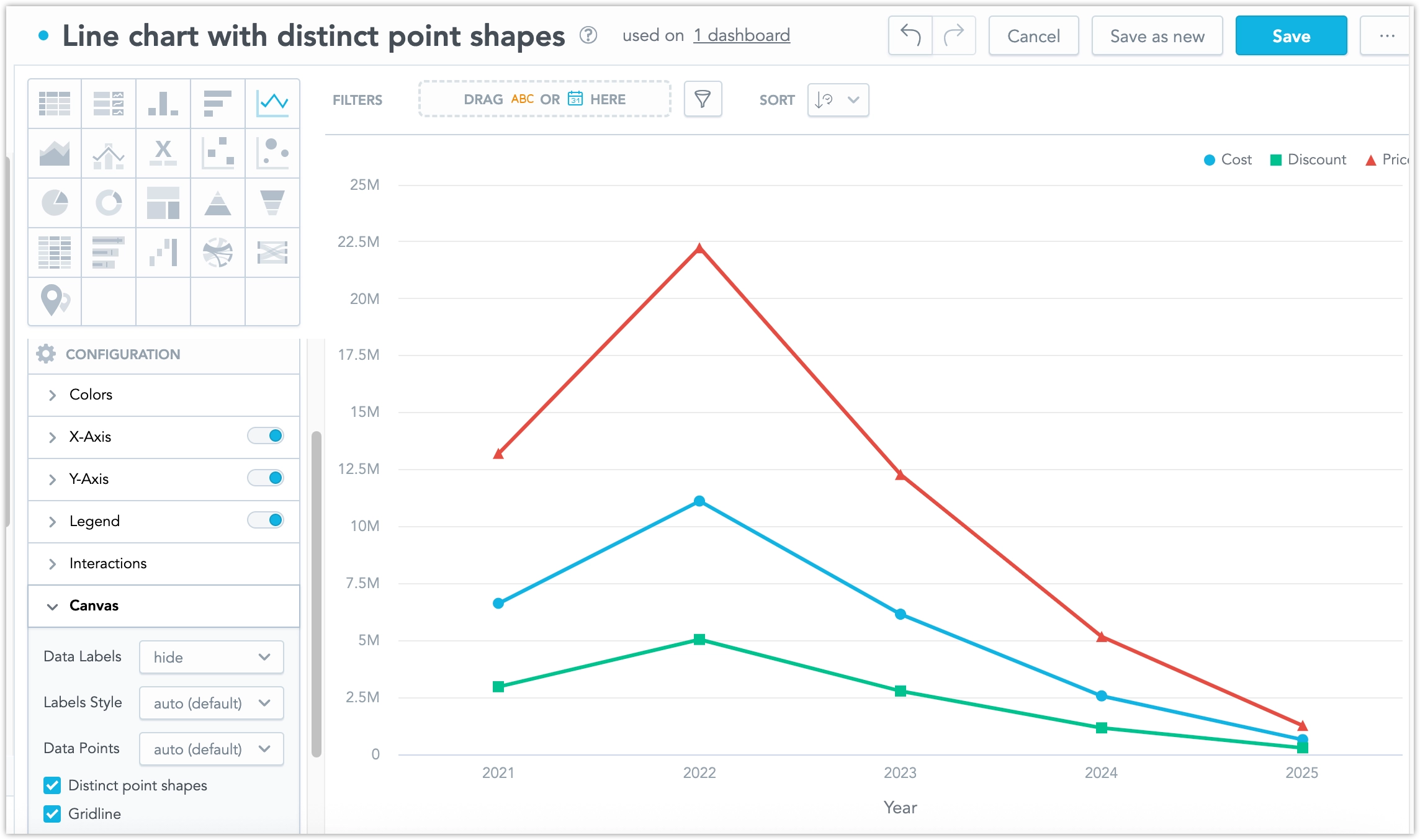 Analytical Designer allows you to change the default properties of your visualizations. You can show or hide axes, disable gridlines, rotate labels, change colors, and so on.