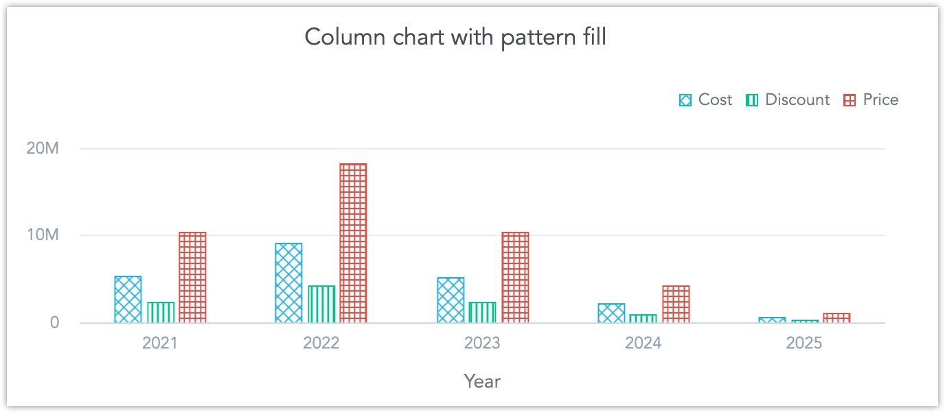 You can change how chart segments are filled to improve contrast and readability. For example, instead of using only solid colors, you can apply pattern fills. With patterns, each column in a column chart is distinguished not only by color but also by texture (such as lines, grids, or dots).