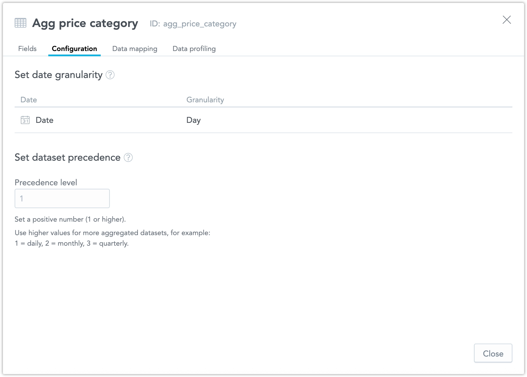 When a user runs a query, the GoodData engine evaluates all datasets that can satisfy it. The dataset with the highest precedence value is selected. Precedence values are numeric and determine priority, i.e. higher numbers mean higher priority.