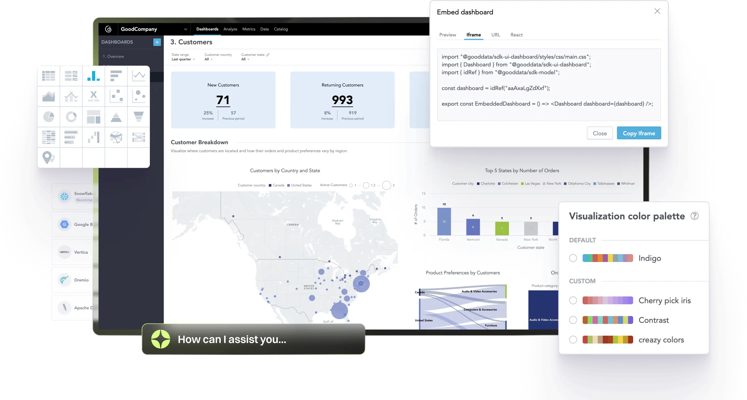 GoodData allows you to fully customize dashboards to match your brand. You can adjust color palettes, fonts, logos, and other visual elements, creating a seamless, white-labeled analytics experience for your users.